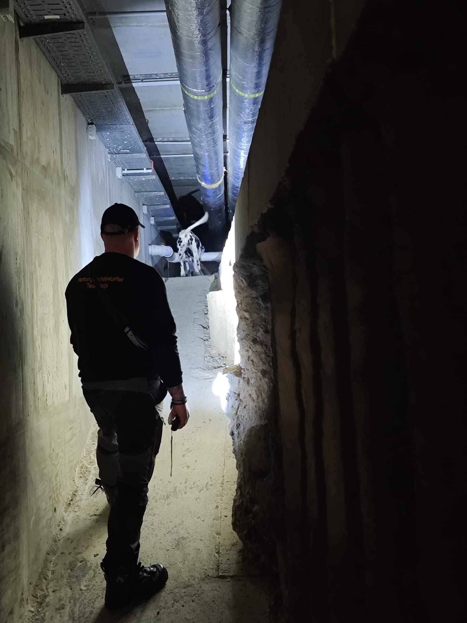 Für Einige das erste Mal, für Andere vertraute Umgebung. Drei anspruchsvolle Tage für Hund und Mensch standen auf der Tagesordnung: u.a. ein Parcours einer Atemschutzstrecke der Feuerwehr, Training in einem ehemaligen Schwimmbad mit extremer Geräuschkulisse und Wärme, sowie Sucheinheiten im unterirdischen Labyrinth der Felsengänge.